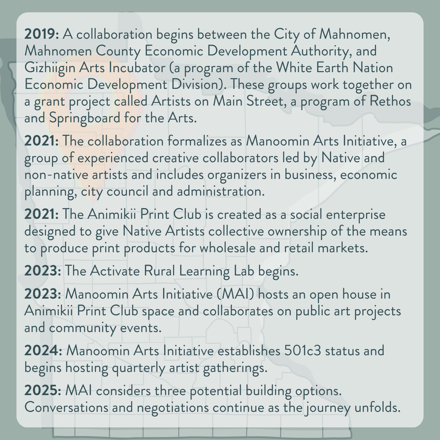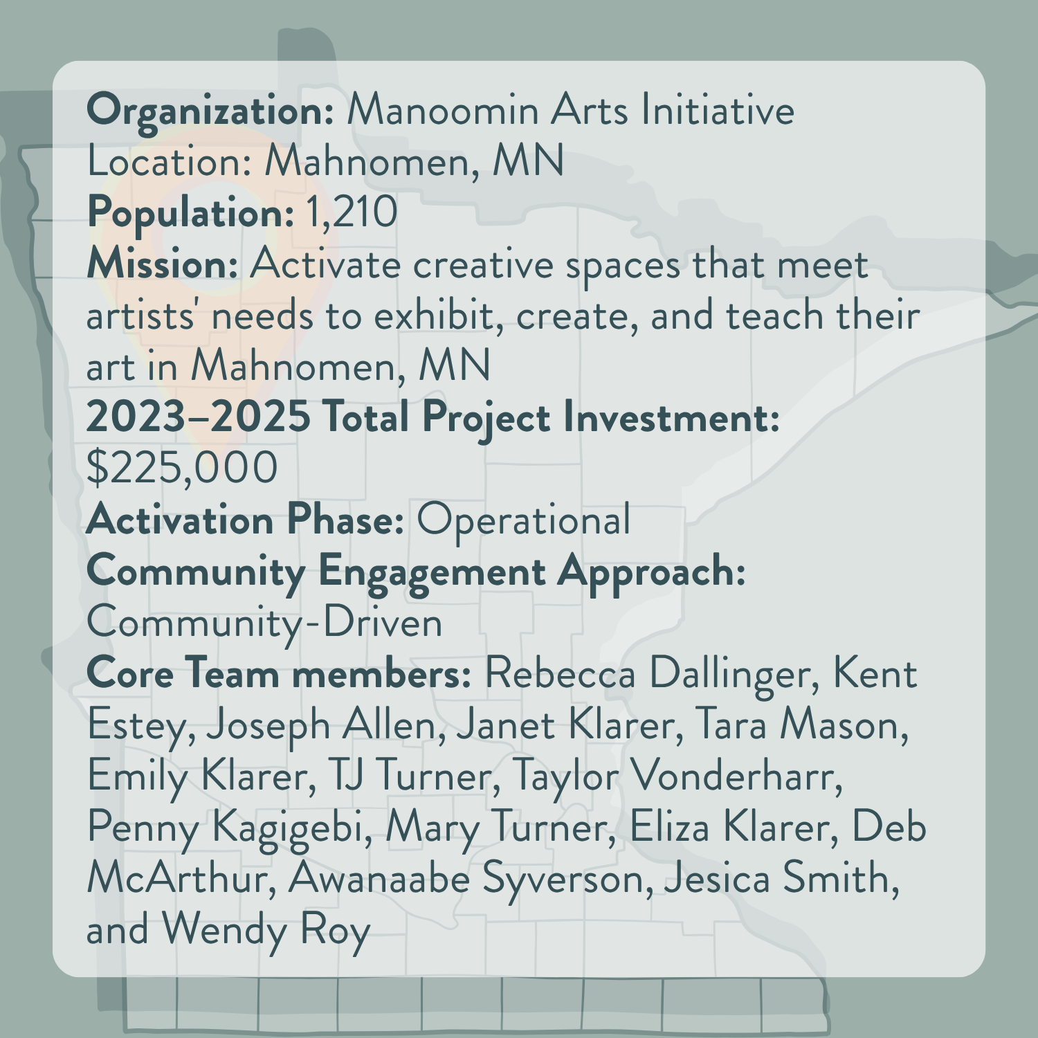 Located in rural northwest Minnesota, Mahnomen is the largest incorporated town within the White Earth Nation (WEN). Mahnomen (or “Manoomin”) means wild rice, the sacred grain that has been harvested in the region for many centuries. Over half of the population of Mahnomen identifies as Indigenous, with a strong and growing focus on Native art and the value that artists bring to the community.