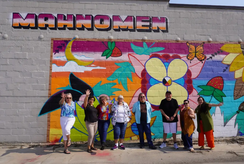 Members of the Manoomin Arts Initiative team in front of a youth-led mural project in downtown Mahnomen.