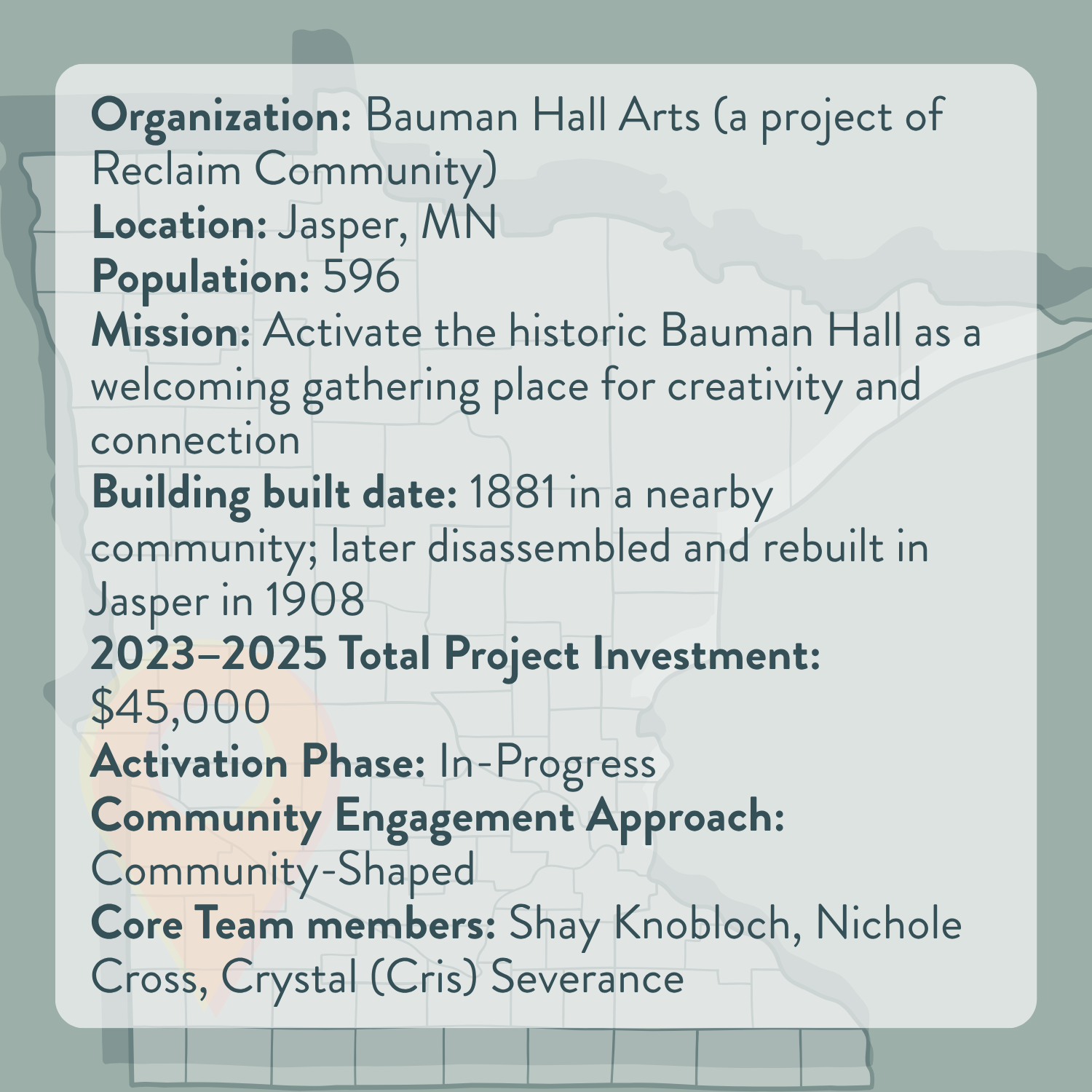 The Activate Rural Learning Lab experience provided the Bauman Hall Arts team with a unique opportunity to test events in the space, which ultimately solidified their goal to preserve the building. To be able to take on renovations of that magnitude, the board has been actively working on building their own capacity. They are currently working on contracting for an energy audit that will ultimately allow them to fundraise for window repair and a new HVAC system.