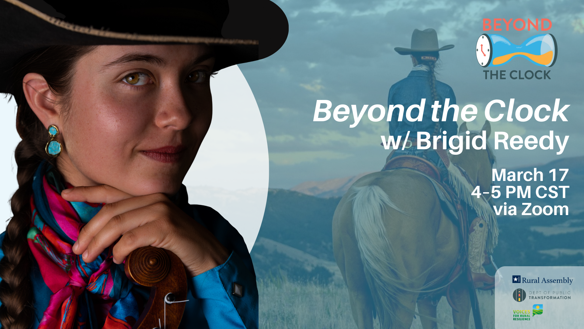 Join us for an inspiring virtual conversation with rural artist, musician, poet, and storyteller Brigid Reedy (Dillon, Montana) at our next Beyond the Clock, which will take place on Tuesday, March 17th from 4 – 5 PM CST.